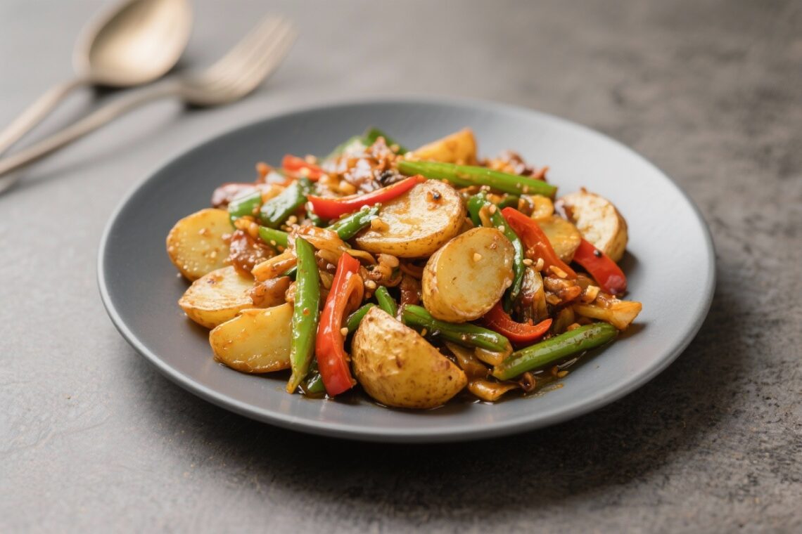 - Low-oil version: Air-fry the par-cooked potatoes at 400°F (200°C) for 10–12 minutes until crisp, then toss with the stir-fry sauce and veggies in a hot pan.